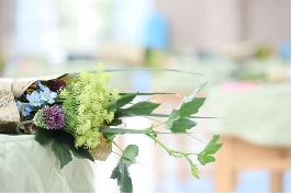 春日私语的花艺空间内,菖蒲叶脉舒展如翡翠般翠绿,弯葱花球悬垂宛若云霞般绚烂,明黄色的茴香花与淡蓝色的飞燕草碎花如同星辰般点缀其间。老师们轻抚着带着晨露的花材,银剪裁剪茎干的脆响仿佛在叩击时光的门扉。花艺导师秉持着“每片叶子都是信纸的纹路,每朵花都是未写完的句子”的创作理念,引导老师们将天然花材转化为情感载体:有人用青翠的枝条勾勒出月牙的弧线,有人将细碎的花朵藏入叶脉的褶皱之中,更有人特意保留植物的蜿蜒形态,恰似母爱包容着生命最本真的模样。