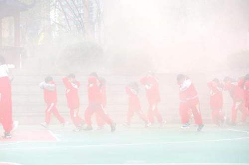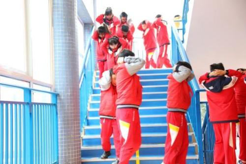 短暂避险后,二次警报拉响——撤离信号来了!“弯腰!护头!贴墙走!”师生们按照预定路线,快速、有序向操场指定区域撤离,全程紧张而不慌乱。