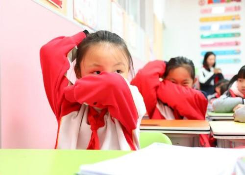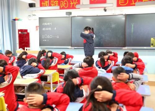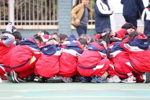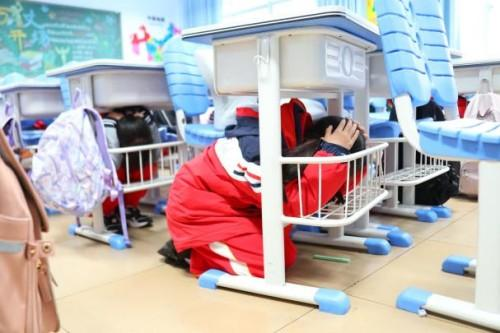 上午9时25分,地震预警警报率先响起。“紧急避险!双手护头!躲到桌下!”班主任们快速下达指令。同学们立刻蜷缩身体,双手紧紧护住头部和颈部,躲在课桌下方的安全三角区;老师们提醒同学们调整姿势,确保全员处于安全位置。