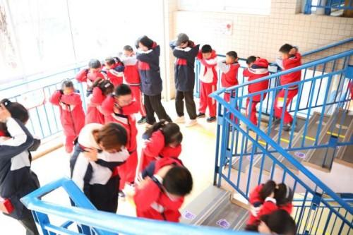 地震避险撤离刚结束,消防警报随即拉响。“弯腰!捂口鼻!靠墙走!”熟悉的指令再次响起,孩子们迅速切换动作,捂住口鼻,小碎步紧跟队伍。还主动化身“小安全员”,提醒身后同学保持间距、不推挤。楼道里,引导老师的声音清晰而坚定:“不要慌,跟我来!”各班班主任在操场快速清点人数,段长依次汇报人数。一声声报告,是演练现场最安心的回音。