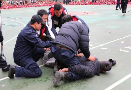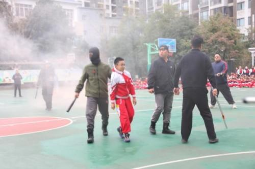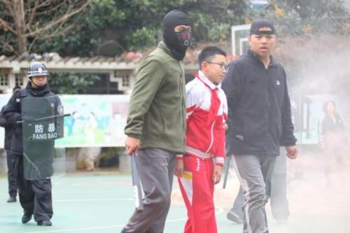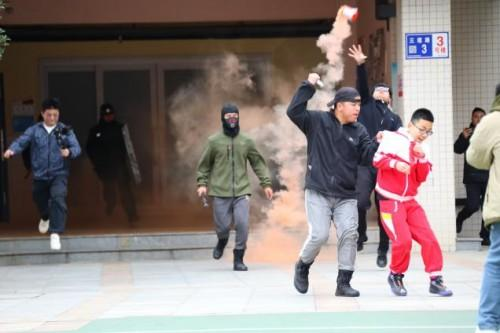 正当师生们整队总结时,几名“歹徒”手持凶器强行翻墙闯进校园,一把抓住身旁的学生作为“人质”,情绪激动地试图靠近学生队伍,现场气氛瞬间凝固,紧张感扑面而来!