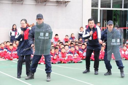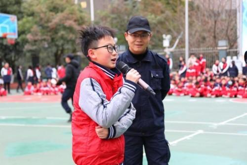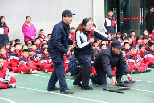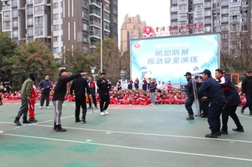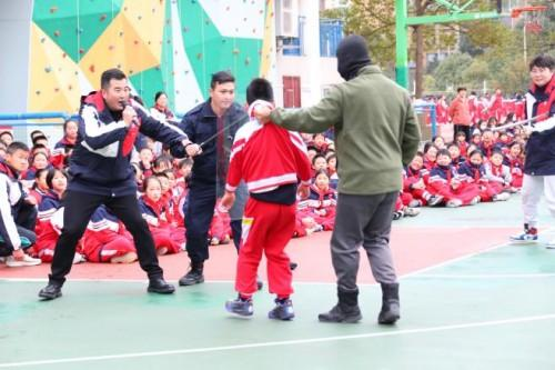 与此同时,早已待命的防恐防爆小组悄悄从两侧迂回包抄,默契配合形成合围之势。低年级孩子虽面露紧张,却能紧紧捂住嘴巴,听从老师指令安静躲到安全区域;高年级学生展现出超乎年龄的镇定与勇气。就在“歹徒”被对话吸引、注意力分散的瞬间,安保组找准时机迅速出击,一招制敌成功制服“歹徒”,整场处置果断高效,赢得了在场师生的连连赞叹。